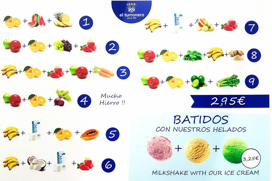 Vamos a hablar de nuestros helados hechos con leche fresca de Menorca traída cada día directamente de Coinga. Hechos con frutas naturales, escogidas avellanas, pistachos de Turquía, fresas de Menorca, tiramisú con bizcocho, ron con pasas emborrachadas, yogurt natural, café, moras de las zarzas, etc. , etc. hasta 42 sabores en los meses fuertes del verano.