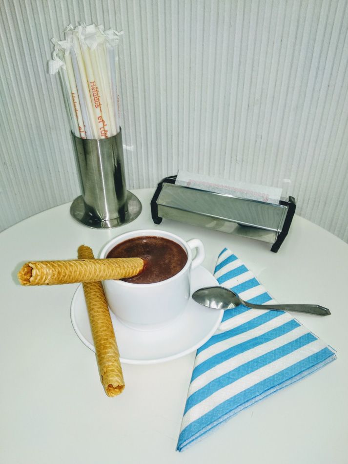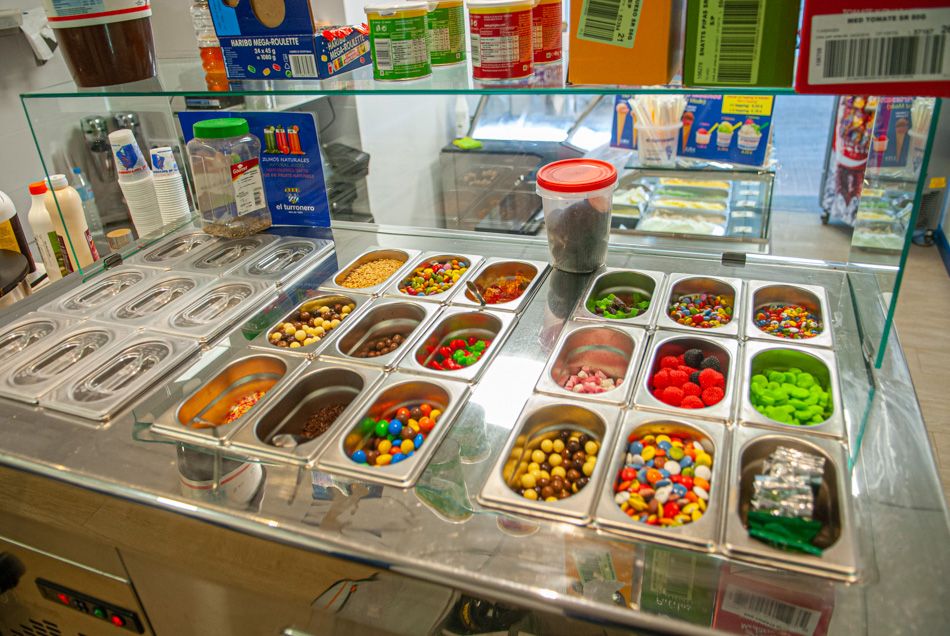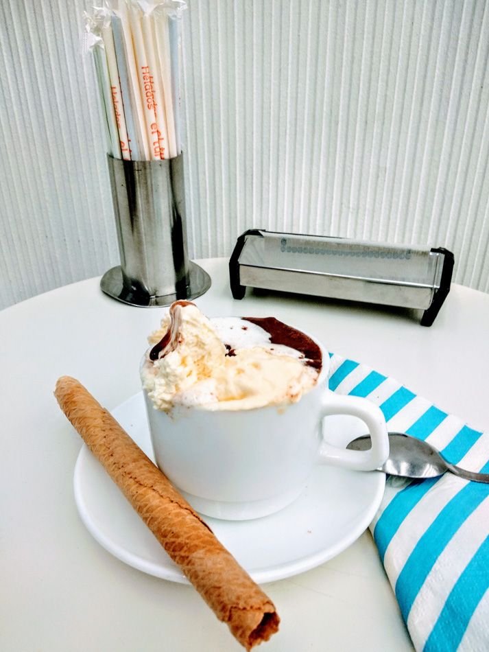 Leche merengada, granizado de café, también con una bola de vainilla, horchata con helado de avellanas o chocolate, cuando refresca chocolate caliente con nata, batidos de helado con leche, crepes, gofres, bocadillos, cafés, pastas.